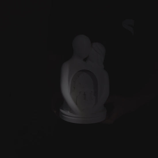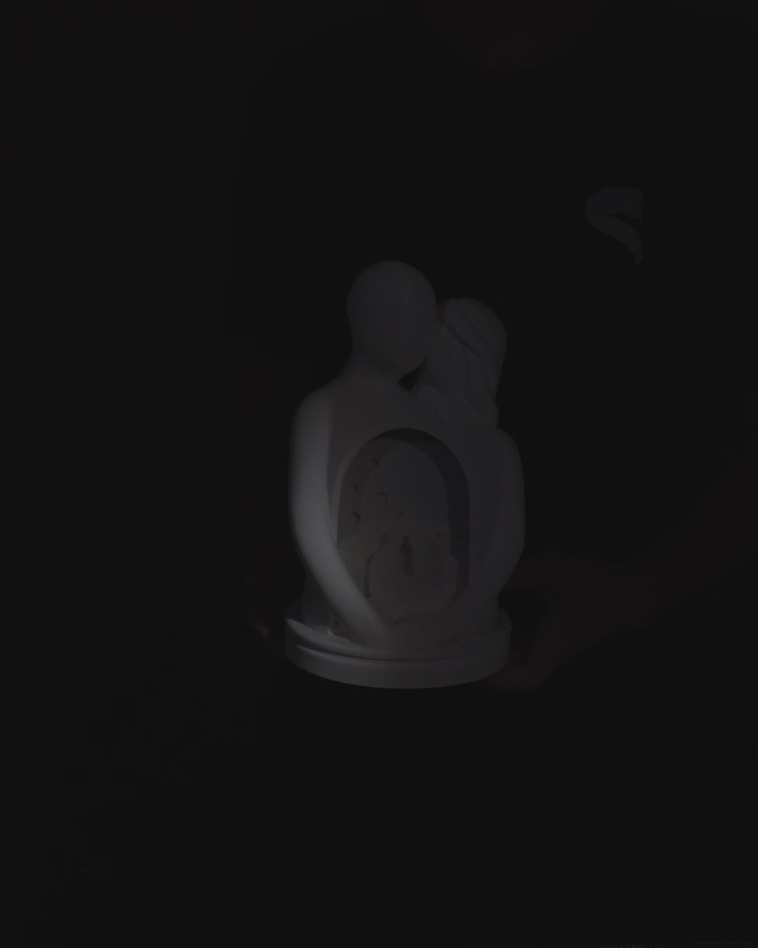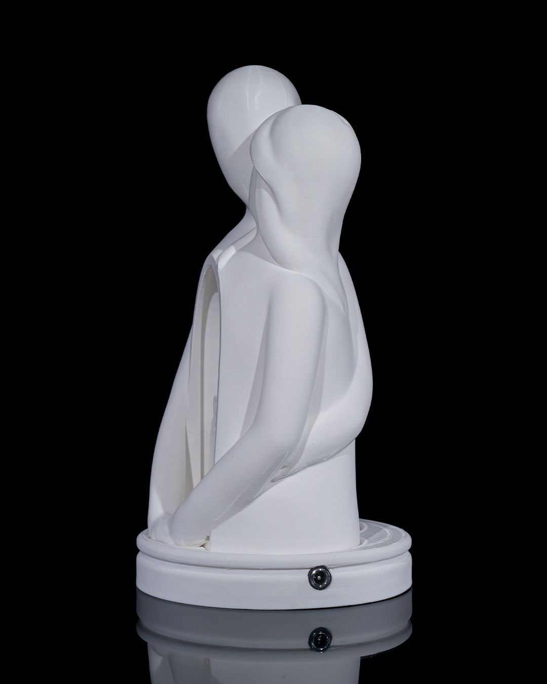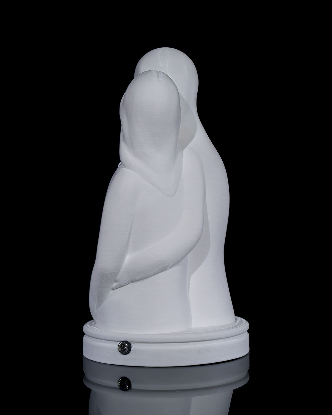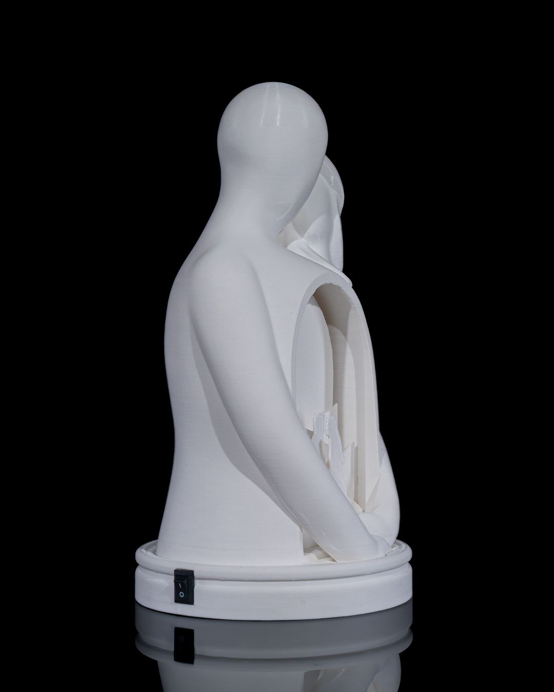 De binnenkant van de print bestaat uit vijf losse plaatjes die opeenvolgend in de lamp zijn geschoven. De hele 3D print wordt in een witte kleur geproduceerd.