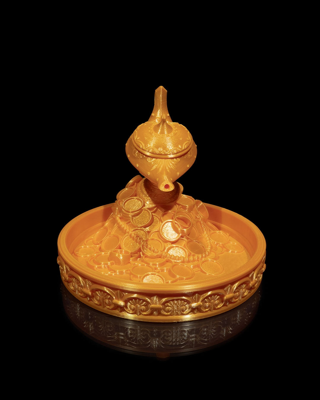 Deze 3D-geprinte wierookhouder creëert een magisch schouwspel. De rook stroomt uit de lamp en valt sierlijk in een goudkleurig fonteintje. Het elegante ontwerp, met verfijnde details, maakt het niet alleen een rustgevend stuk, maar ook een stijlvolle toevoeging aan je interieur. Perfect voor meditatie of om een mystieke sfeer te creëren in elke ruimte.