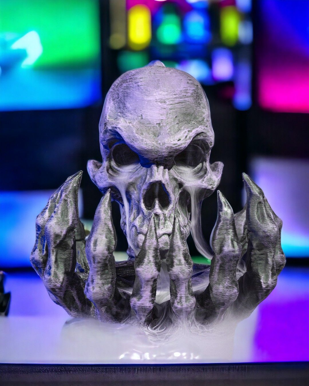 De mysterieuze backflow wierookhouder in de vorm van een phantom, ondersteund door sinistere handen. Wanneer de wierook brandt, zakt de rook spookachtig door de ogen, vloeiend richting de handen eronder. Dit dramatische en intrigerende ontwerp creëert een sfeervol en mystiek accent, perfect voor ontspanning of een gotische uitstraling in je ruimte.