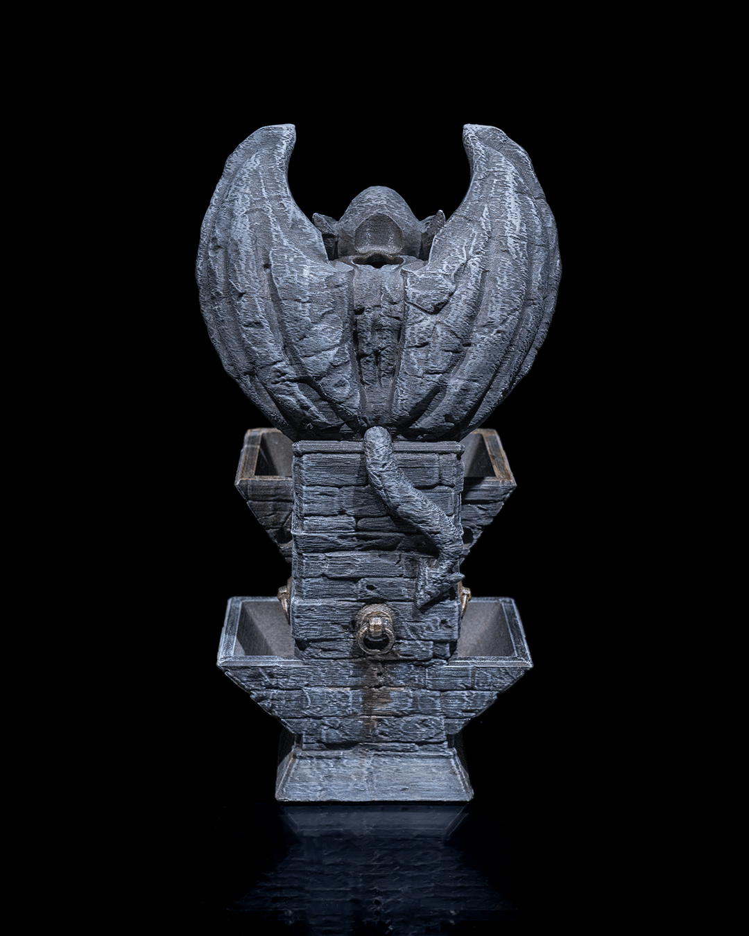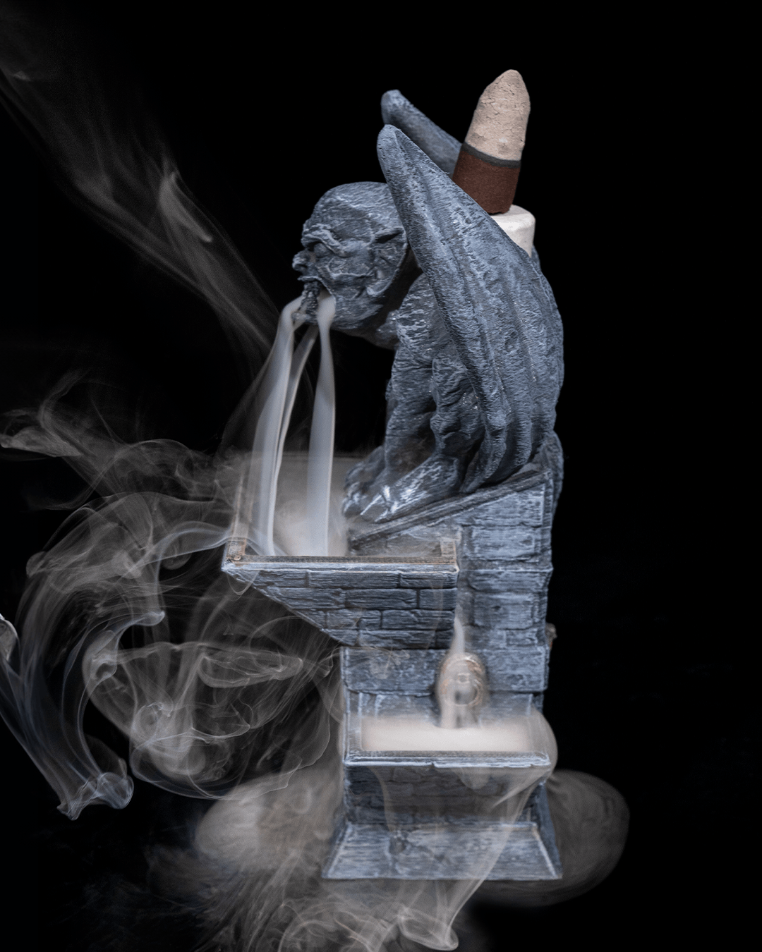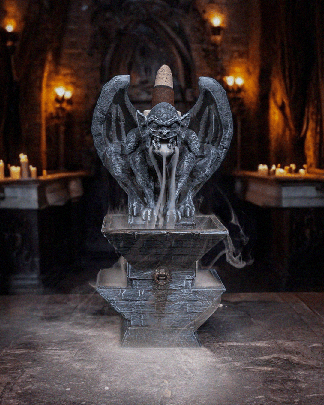 Deze mystieke wierookhouder toont een imposante gargoyle zittend op een toren. Wanneer je een backflow wierookkegel plaatst, ontsnapt de rook op indrukwekkende wijze uit de mond van de gargoyle, alsof hij een duistere adem uitstoot. Het ontwerp is gedetailleerd en krachtig, met een gotische uitstraling die een unieke sfeer creëert. Perfect voor liefhebbers van fantasie en mysterie, en ideaal om je ruimte een dramatisch accent te geven. Deze houder voegt zowel karakter als stijl toe aan elke kamer en brengt de sfeer tot leven met zijn rookspel.